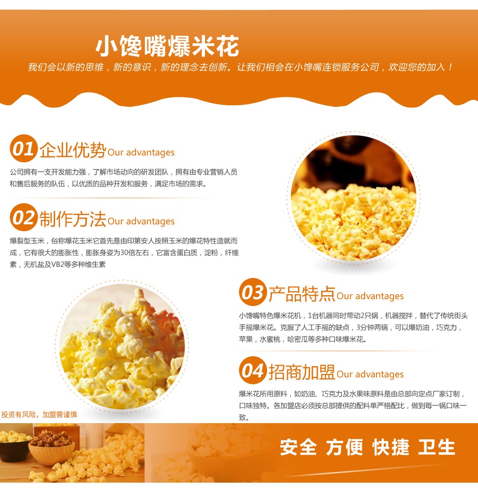 4、爆米花所用原料,如奶油、巧克力及水果味原料是由總部向定點廠家訂制,口味獨特。各加盟店必須按總部提供的配料單嚴格配比,做到每一鍋口味一致。